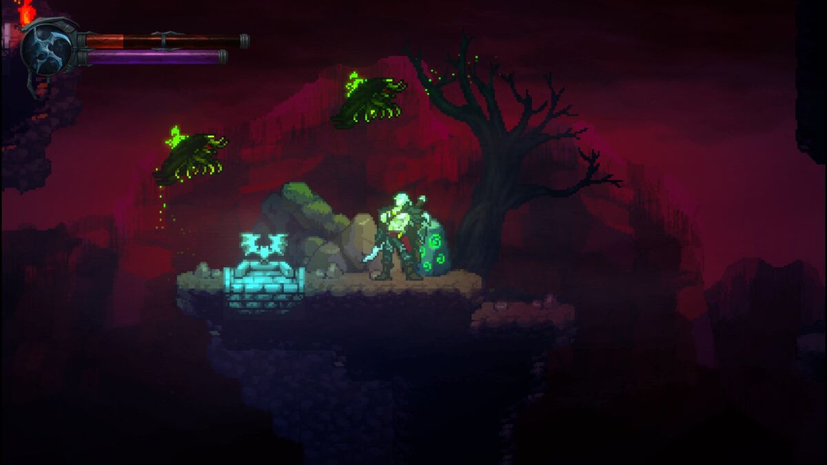 There are various types of enemies but little variety within them. Flying enemies that vary in form but all act the same. Humanoid enemies take the form of various close-quarters and ranged enemies. But when triggered, enemies react in weird ways: they fall off ledges and jump around randomly. In terms of combat, you can slash, and that is it. You can also parry, which shows intent to make the combat more engaging. However, it’s just as easy to randomly hack at opponents and jump around to avoid being hit. You can also flap your wings to fly briefly by tapping the jump button – yes, just like Flappy Bird. This mechanic quickly becomes more frustrating than fun.