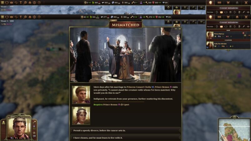 The only practical effect of a new character title is the increase of legitimacy, but from a narrative perspective the Cognomen exemplifies and emphasizes the character’s actions. For example, if the leader of the Roman faction settles a certain number of cities they will receive the “Founder” Cognomen, indicating the leader’s success at expanding their faction’s borders.